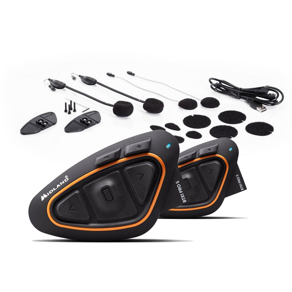 Interkom Midland BTX1 Pro S DUo to zestaw dwóch bezprzewodowych interkoów motocyklowych do kasków z komunikacją Bluetooth. Dostarczany zestaw elementów umożliwia montaż kompletnego rozwiązania w kaskach otwartych jak i ze szczęką (dwie wersje mikrofonu w zestawie) z zachowanie estetyki i pewności mocowania.
